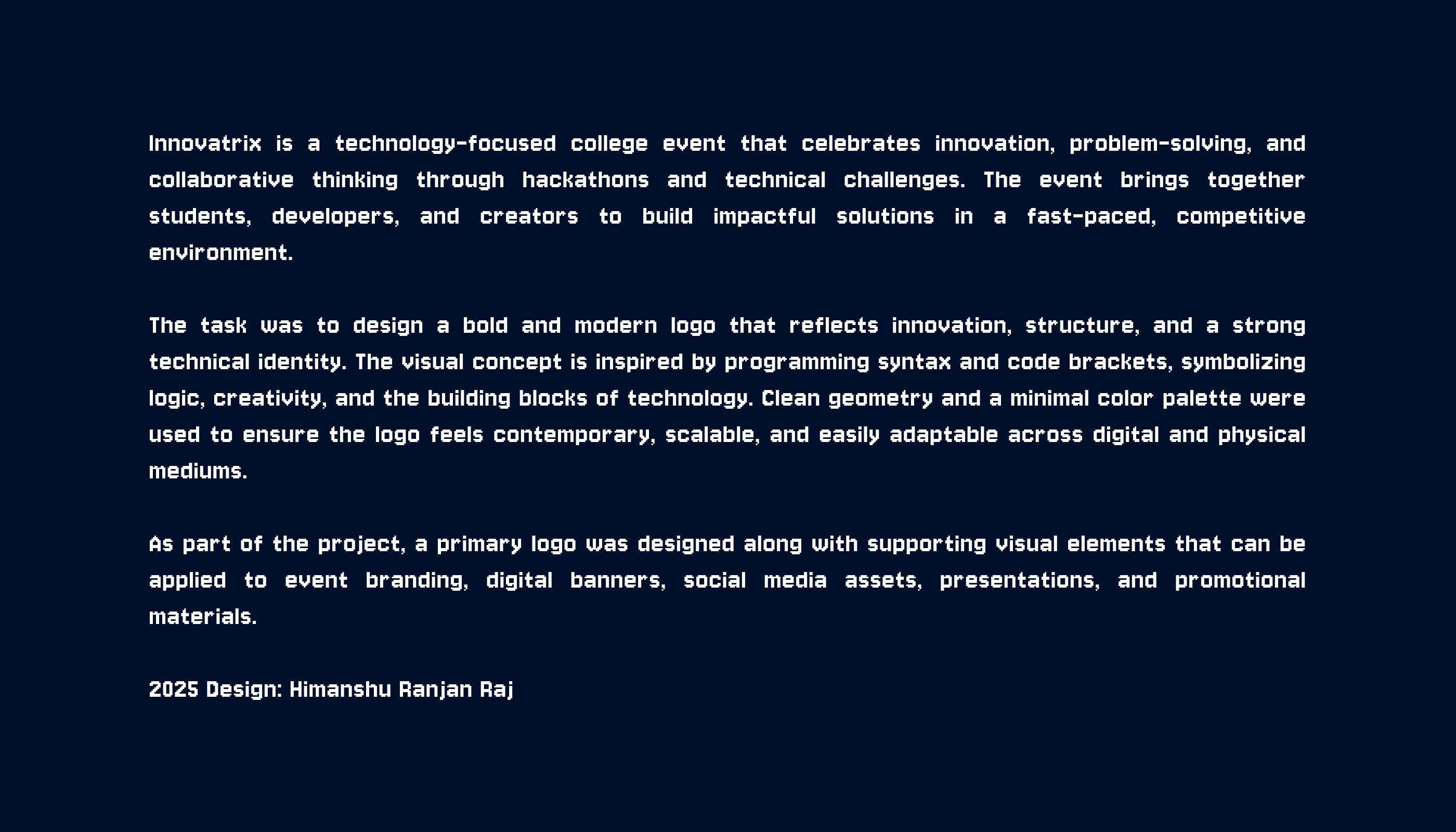 Innovatrix is a technology-focused college event that celebrates innovation, problem-solving, and collaborative thinking through hackathons and technical challenges. The event brings together students, developers, and creators to build impactful solutions in a fast-paced, competitive environment. 2025 Design: Himanshu Ranjan Raj